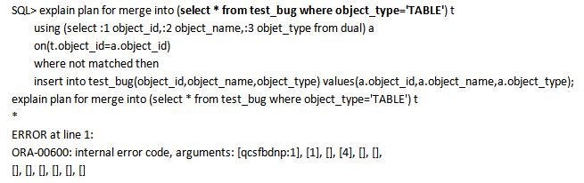 这个语句里的问题我是可以保持了(select * from test_bug where object_type=’TABLE’) t 这个子查询,抛出了 ORA-00600 的错误,我简化一番如何,简化为(select*from test_bug)t 这个子查询,同样还是会抛出一样的错误。